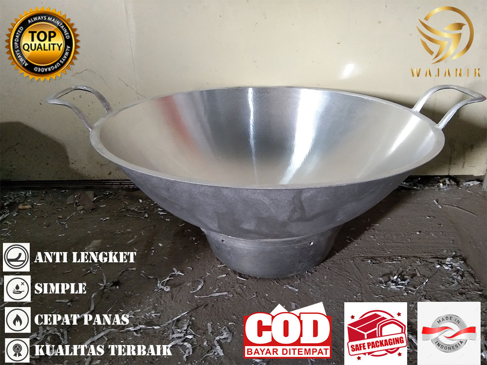 Wajan dengan desain cekung (wok) yang ikonik, dirancang khusus untuk mendistribusikan panas secara merata ke seluruh permukaan.